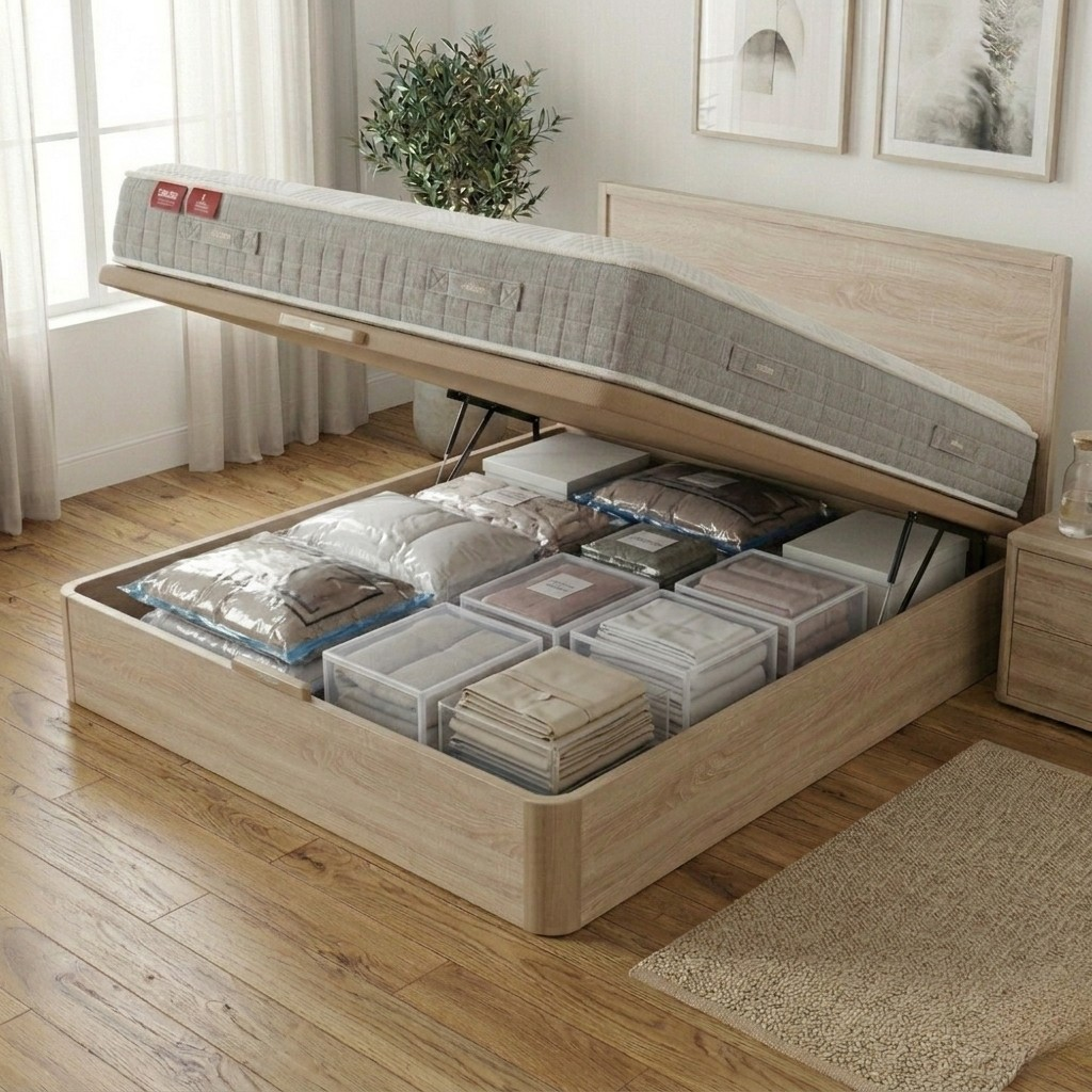 Almacenamiento Inteligente: Capacidad interior de 703 litros (en medida 150×200) para organizar mantas, edredones o ropa de otras temporadas.